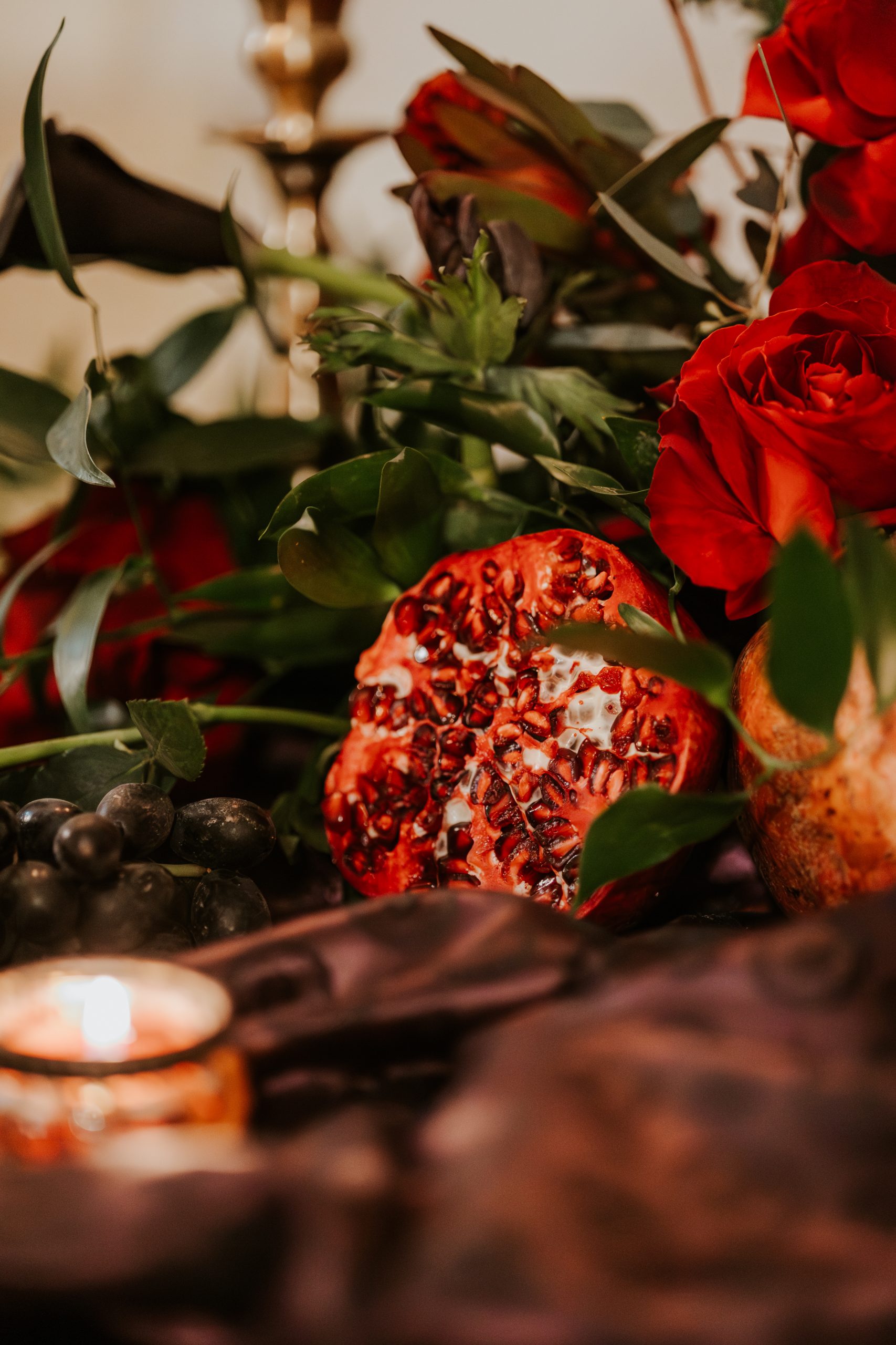 For me, the colour scheme was particularly special: dark plum tones, deep red and rich berry shades gave the decoration an extraordinary depth and elegance. The setting was crowned by a magnificent table, richly decorated with lush fruit, warm candlelight and opulent flower arrangements. It was a sight to behold.