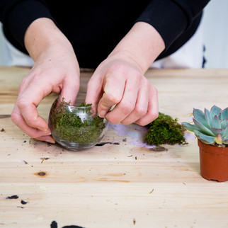 Zuerst kleidest du deine Kugelvasen mit Moos aus um darin die Töpfe für die Sukkulenten zu verstecken, damit das leichter gelingt nimm solange die Pflanzen aus den Töpfen, so kannst du sie besser mit Moos verdecken. Nun die Pflänzchen wieder in den Topf und mit der gelben Schleife verzieren. Bitte nicht gießen, erstens können die Pflanzen längere Zeit ohne Wasser auskommen und zweitens ist es kein schöner Anblick wenn in den Vasen das Wasser steht.